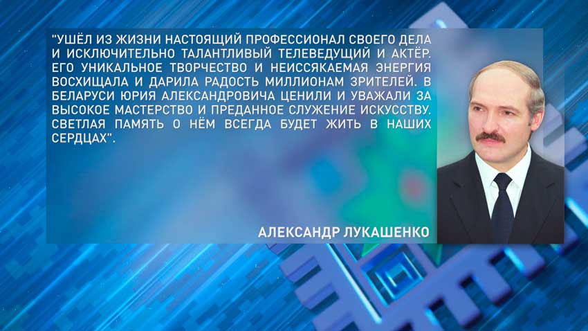 Ушел из жизни настоящий профессионал своего дела и исключительно талантливый телеведущий и актер. Его уникальное творчество и неиссякаемая энергия восхищала и дарила радость миллионам зрителей. В Беларуси Юрия Александровича ценили и уважали за высокое мастерство и преданное служение искусству. Светлая память о нем всегда будет жить в наших сердцах.